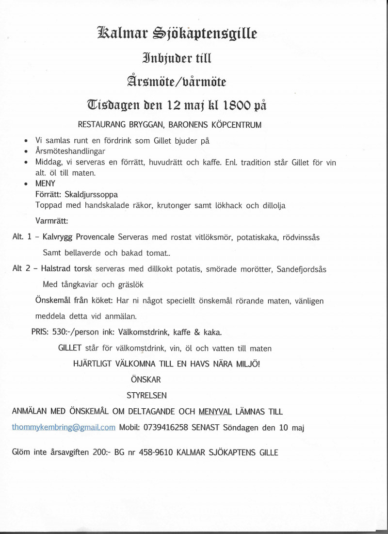 Hej Nils, kan du lägga in en påminnelse på Gillets hemsida och påminna om årsmötet med Kalmar Sjöfartsförening onsdag den 14 maj. Sista anmälan 9 maj!