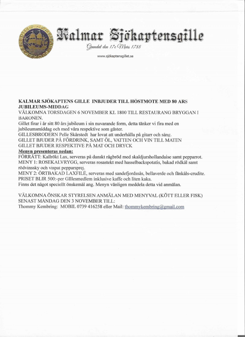 Höstmötet kommer att hållas på Restaurang Bryggan den 8 November klockan 1800.